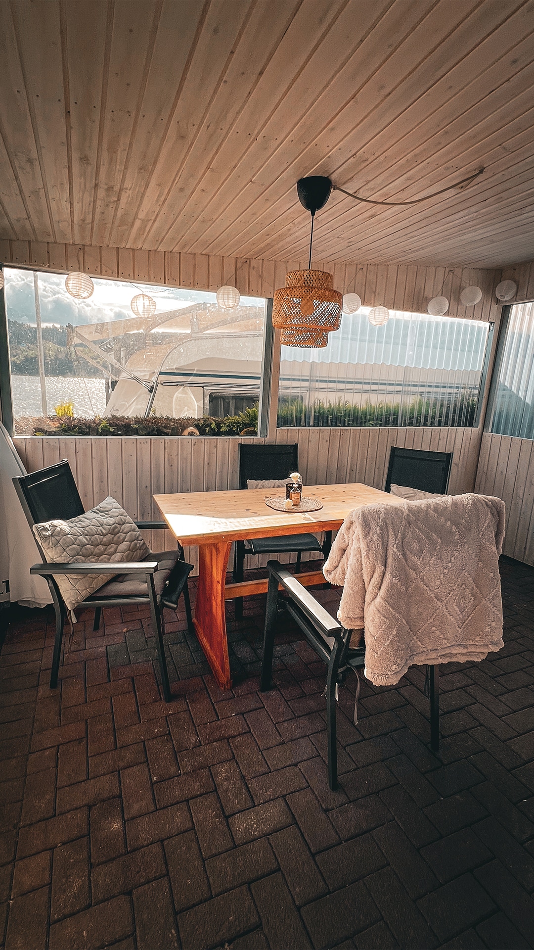 - Eetgelegenheid met tafel en stoelen in de aanbouw