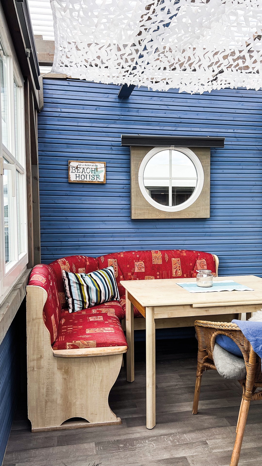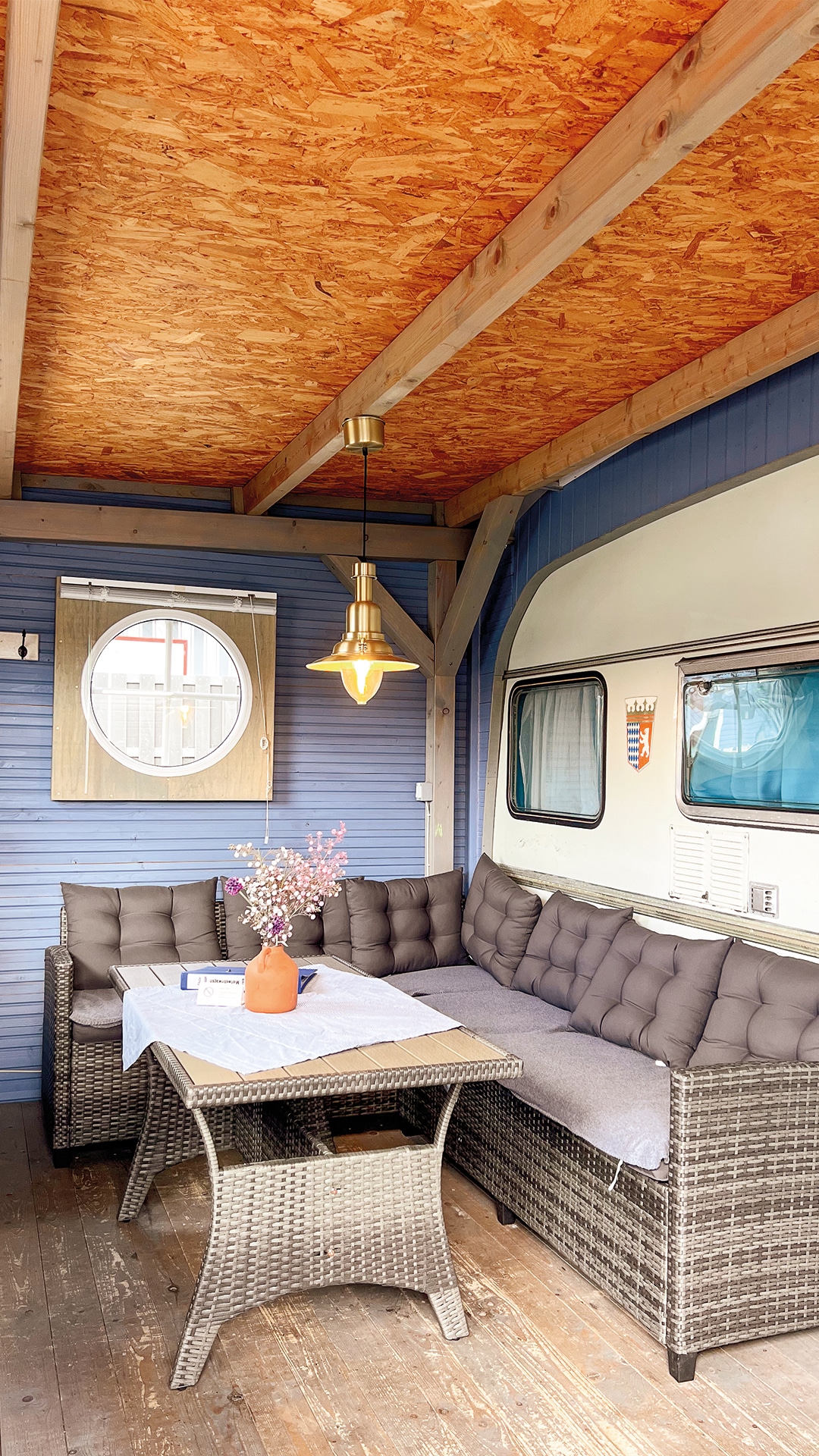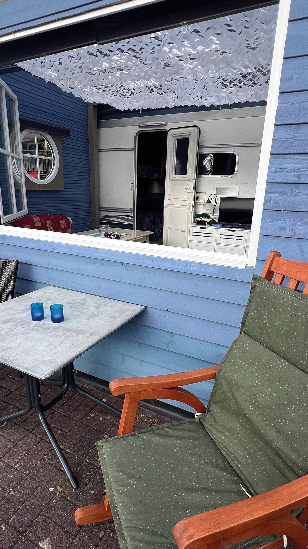 In goede en slechte tijden, althans wat het weer betreft: Huurcaravan Frank overtuigt door zijn vaste aanbouw, ook bij slechter weer. Maar als de zon schijnt, is het heerlijk vertoeven op het terras met grind.