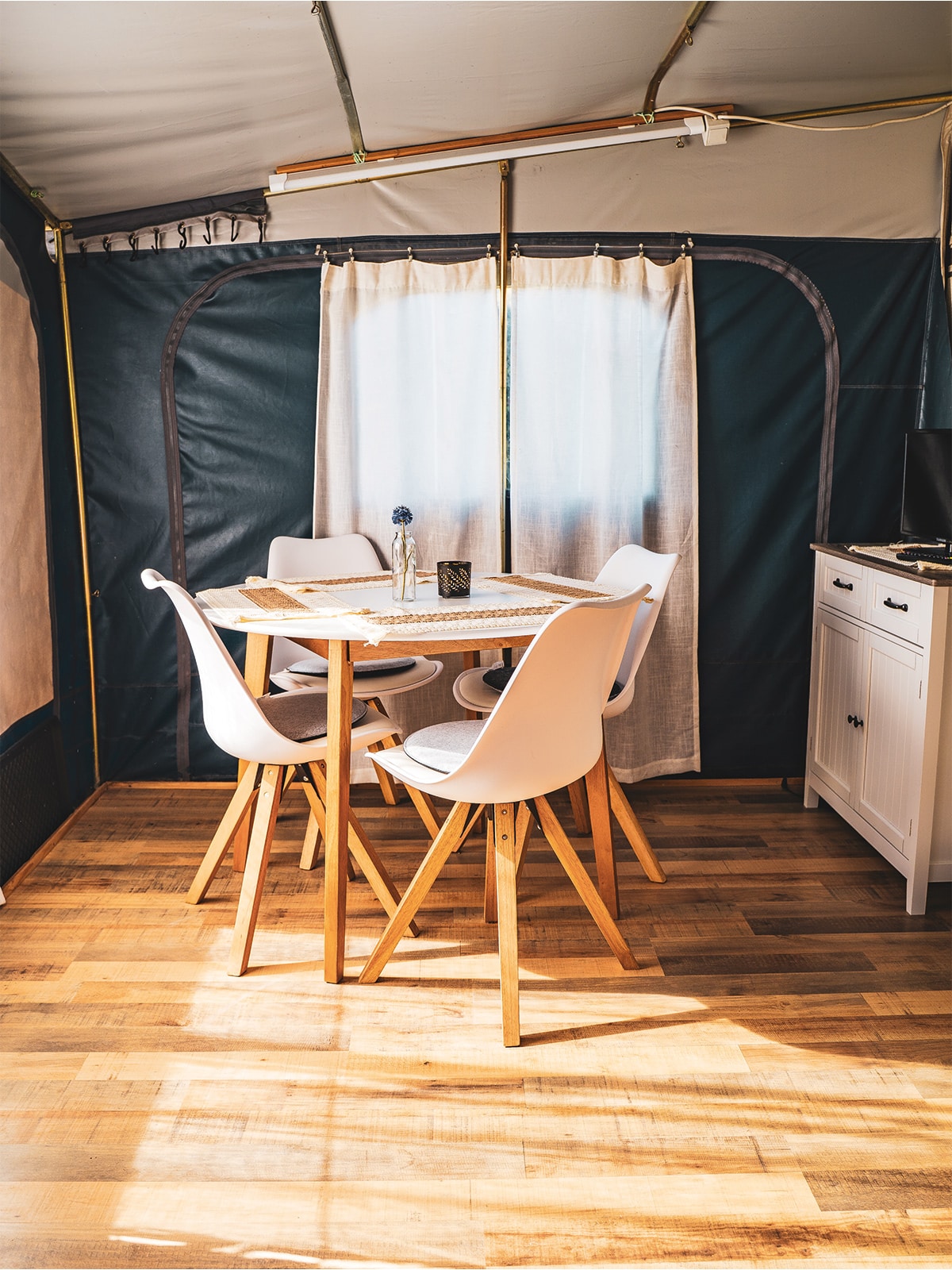 - Eetgelegenheid met tafel en stoelen in de voortent