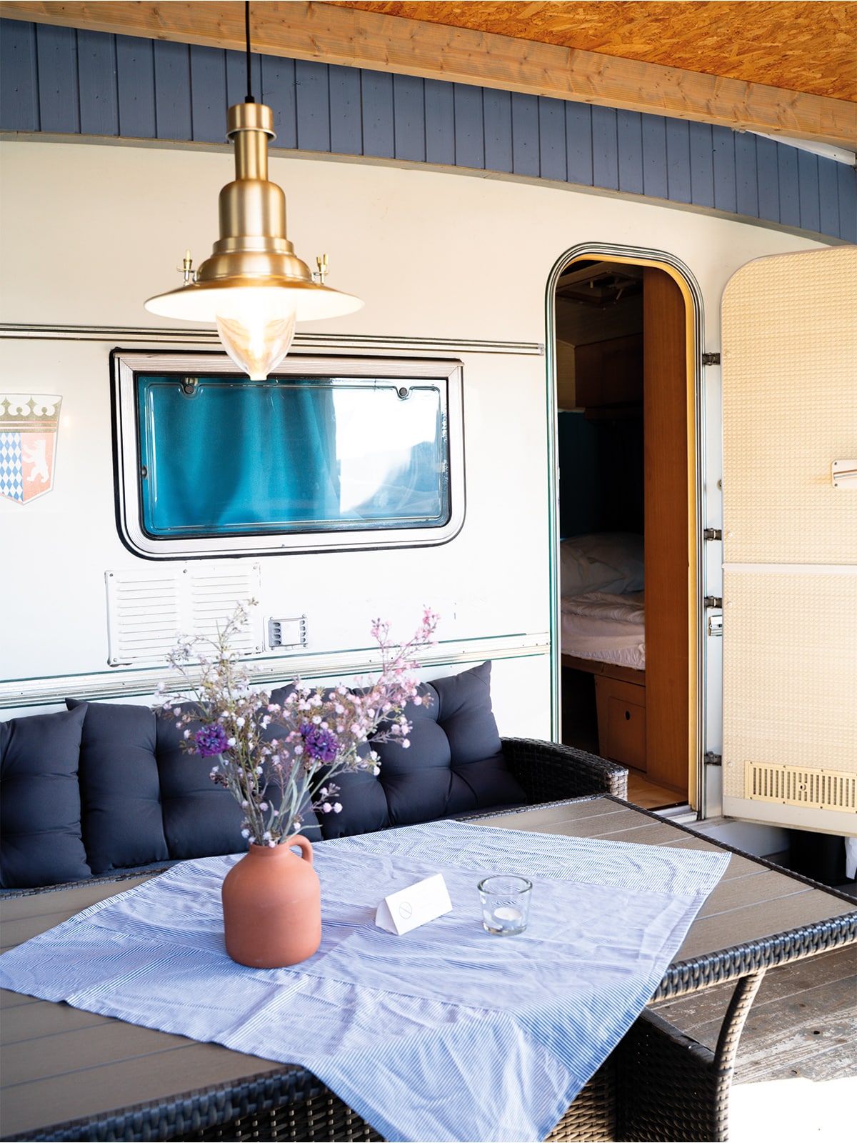 De caravan Harry is een “klein ruimtewonder”: Een ruime voortent met eetgelegenheid en kookplaats, evenals voldoende ruimte om bagage of iets dergelijks te plaatsen, is vast voor de caravan geïnstalleerd. De aanbouw biedt extra leefruimte die bij wind en weer kan worden gebruikt. Slaapmogelijkheden in de wagen zelf zijn aanwezig voor twee volwassenen en een kind. En als de zon schijnt, biedt het aangrenzende zonneterras met gazon ruimte voor uitgebreid zonnebaden. Houd er rekening mee dat de caravan geen eigen sanitair heeft. Gebruik de sanitaire voorzieningen van de camping.